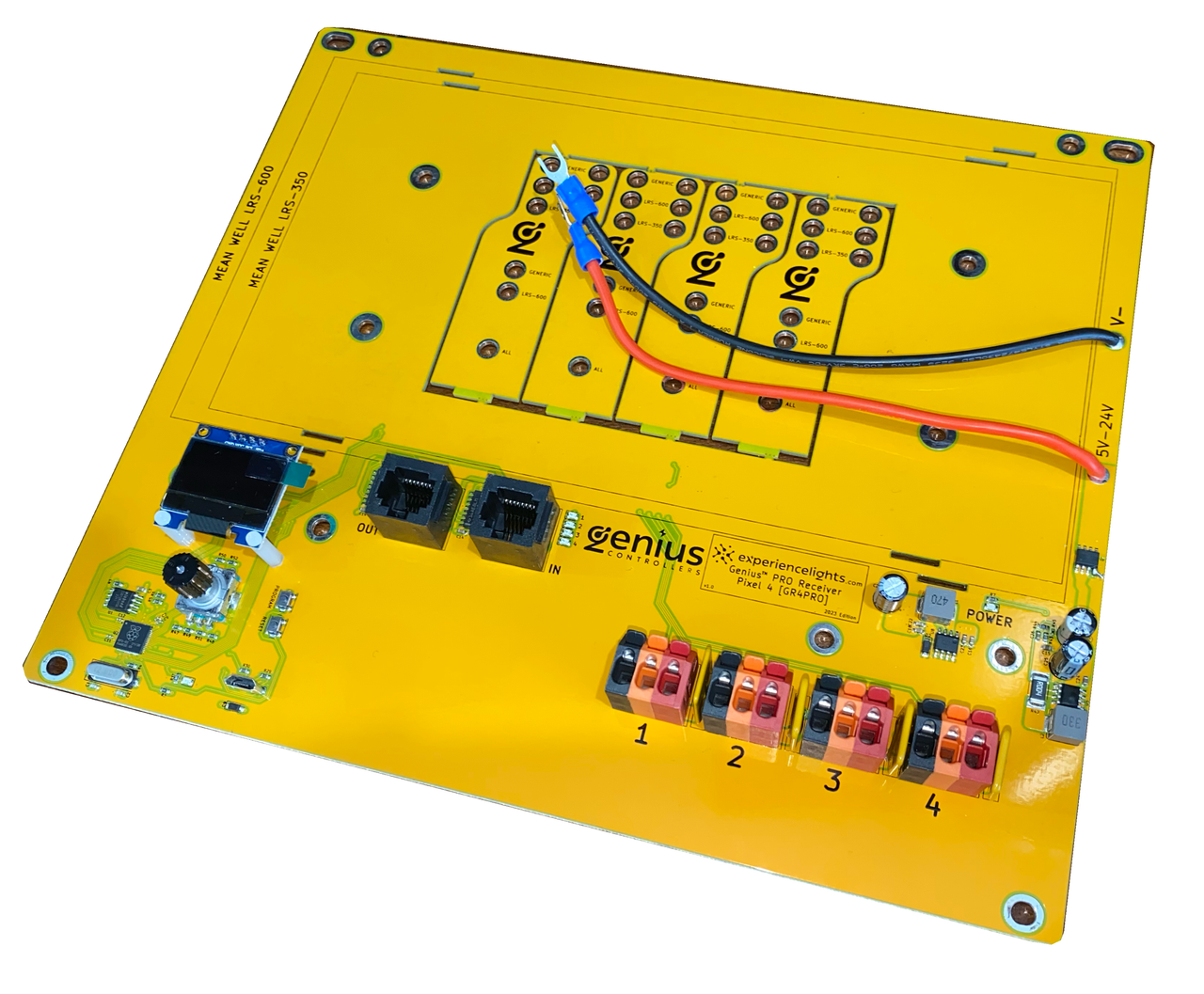 • 4 x 3-pin, extra large, color coded Clever LockTM connectors (no phoenix connectors or screw down terminals)